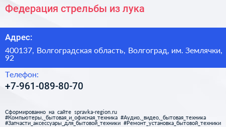 Федерация стрельбы из лука по адресу 400137, Волгоградская область, Волгоград, им. Землячки, 92 в дальнейшем Организация, размещена в следующих категориях:
