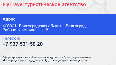 FlyTravel, туристическое агентство по адресу 400001, Волгоградская область, Волгоград, Рабоче-Крестьянская, 9 в дальнейшем Организация, размещена в следующих категориях: