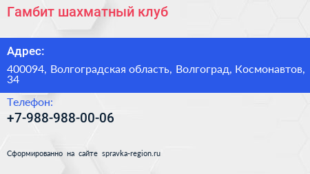 Гамбит, шахматный клуб по адресу 400094, Волгоградская область, Волгоград, Космонавтов, 34 в дальнейшем Организация, размещена в следующих категориях: