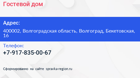Гостевой дом по адресу 400002, Волгоградская область, Волгоград, Бекетовская, 16 в дальнейшем Организация, размещена в следующих категориях: