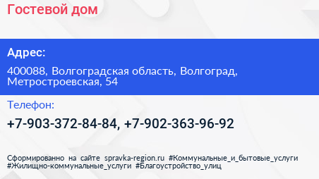 Гостевой дом по адресу 400088, Волгоградская область, Волгоград, Метростроевская, 54 в дальнейшем Организация, размещена в следующих категориях: