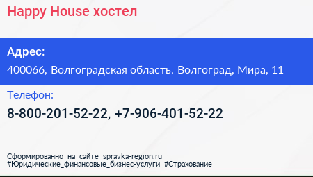 Happy House, хостел по адресу 400066, Волгоградская область, Волгоград, Мира, 11 в дальнейшем Организация, размещена в следующих категориях: