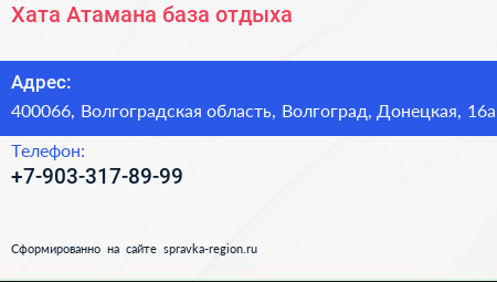 Хата Атамана, база отдыха по адресу 400066, Волгоградская область, Волгоград, Донецкая, 16а в дальнейшем Организация, размещена в следующих категориях: