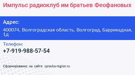 Импульс, радиоклуб им. братьев Феофановых по адресу 400074, Волгоградская область, Волгоград, Баррикадная, 1д в дальнейшем Организация, размещена в следующих категориях: