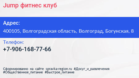 Jump, фитнес-клуб по адресу 400105, Волгоградская область, Волгоград, Богунская, 8 в дальнейшем Организация, размещена в следующих категориях: