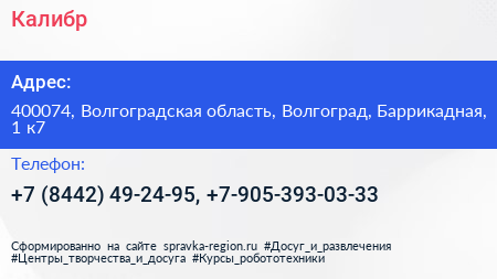 Калибр по адресу 400074, Волгоградская область, Волгоград, Баррикадная, 1 к7 в дальнейшем Организация, размещена в следующих категориях: