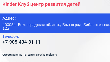 Kinder-Клуб, центр развития детей по адресу 400064, Волгоградская область, Волгоград, Библиотечная, 12а в дальнейшем Организация, размещена в следующих категориях: