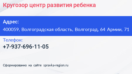 Кругозор, центр развития ребенка по адресу 400059, Волгоградская область, Волгоград, 64 Армии, 71 в дальнейшем Организация, размещена в следующих категориях: