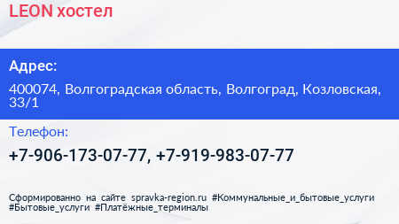 LEON, хостел по адресу 400074, Волгоградская область, Волгоград, Козловская, 33/1 в дальнейшем Организация, размещена в следующих категориях: