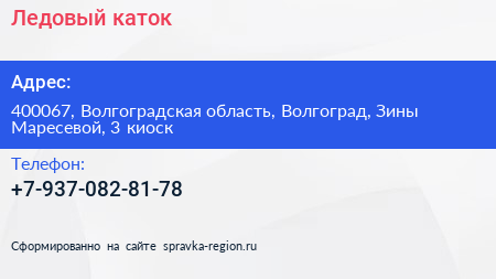 Ледовый каток по адресу 400067, Волгоградская область, Волгоград, Зины Маресевой, 3 киоск в дальнейшем Организация, размещена в следующих категориях: