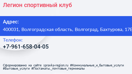 Легион, спортивный клуб по адресу 400031, Волгоградская область, Волгоград, Бахтурова, 17Б в дальнейшем Организация, размещена в следующих категориях: