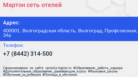 Мартон, сеть отелей по адресу 400001, Волгоградская область, Волгоград, Профсоюзная, 34а в дальнейшем Организация, размещена в следующих категориях: