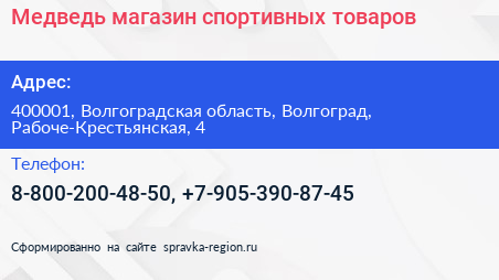 Медведь, магазин спортивных товаров по адресу 400001, Волгоградская область, Волгоград, Рабоче-Крестьянская, 4 в дальнейшем Организация, размещена в следующих категориях: