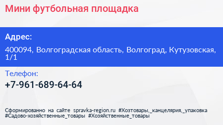 Мини-футбольная площадка по адресу 400094, Волгоградская область, Волгоград, Кутузовская, 1/1 в дальнейшем Организация, размещена в следующих категориях: