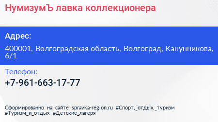 НумизумЪ, лавка коллекционера по адресу 400001, Волгоградская область, Волгоград, Канунникова, 6/1 в дальнейшем Организация, размещена в следующих категориях: