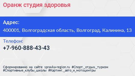 Оранж, студия здоровья по адресу 400001, Волгоградская область, Волгоград, Калинина, 13 в дальнейшем Организация, размещена в следующих категориях: