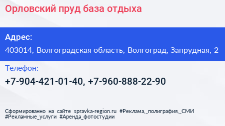 Орловский пруд, база отдыха по адресу 403014, Волгоградская область, Волгоград, Запрудная, 2 в дальнейшем Организация, размещена в следующих категориях: