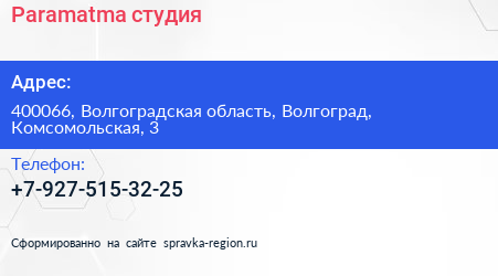 Paramatma, студия по адресу 400066, Волгоградская область, Волгоград, Комсомольская, 3 в дальнейшем Организация, размещена в следующих категориях: