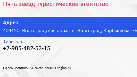 Пять звезд, туристическое агентство по адресу 404120, Волгоградская область, Волгоград, Карбышева, 76 в дальнейшем Организация, размещена в следующих категориях: