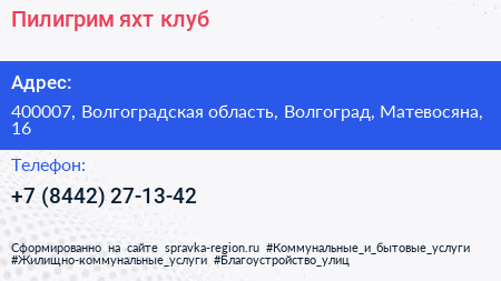 Пилигрим, яхт-клуб по адресу 400007, Волгоградская область, Волгоград, Матевосяна, 16 в дальнейшем Организация, размещена в следующих категориях: