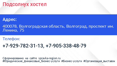 Подсолнух, хостел по адресу 400078, Волгоградская область, Волгоград, проспект им. Ленина, 75 в дальнейшем Организация, размещена в следующих категориях: