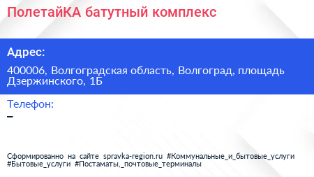 ПолетайКА, батутный комплекс по адресу 400006, Волгоградская область, Волгоград, площадь Дзержинского, 1Б в дальнейшем Организация, размещена в следующих категориях: