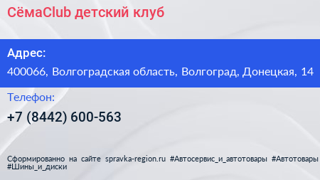 СёмаClub, детский клуб по адресу 400066, Волгоградская область, Волгоград, Донецкая, 14 в дальнейшем Организация, размещена в следующих категориях: