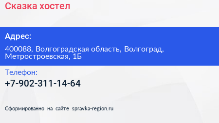 Сказка, хостел по адресу 400088, Волгоградская область, Волгоград, Метростроевская, 1Б в дальнейшем Организация, размещена в следующих категориях: