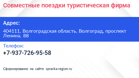 Совместные поездки, туристическая фирма по адресу 404111, Волгоградская область, Волгоград, проспект Ленина, 88 в дальнейшем Организация, размещена в следующих категориях: