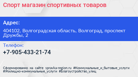 Спорт, магазин спортивных товаров по адресу 404102, Волгоградская область, Волгоград, проспект Дружбы, 2 в дальнейшем Организация, размещена в следующих категориях: