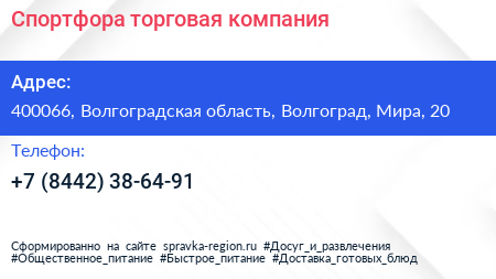 Спортфора, торговая компания по адресу 400066, Волгоградская область, Волгоград, Мира, 20 в дальнейшем Организация, размещена в следующих категориях: