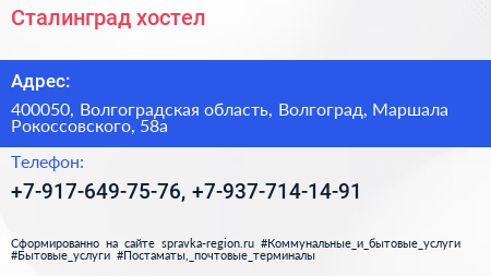 Сталинград, хостел по адресу 400050, Волгоградская область, Волгоград, Маршала Рокоссовского, 58а в дальнейшем Организация, размещена в следующих категориях: