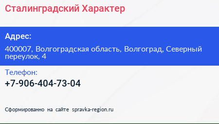 Сталинградский Характер по адресу 400007, Волгоградская область, Волгоград, Северный переулок, 4 в дальнейшем Организация, размещена в следующих категориях: