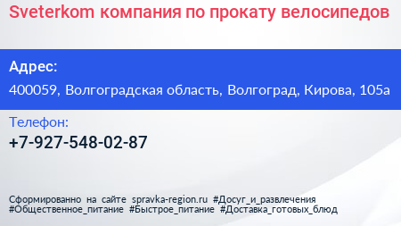 Sveterkom, компания по прокату велосипедов по адресу 400059, Волгоградская область, Волгоград, Кирова, 105а в дальнейшем Организация, размещена в следующих категориях:
