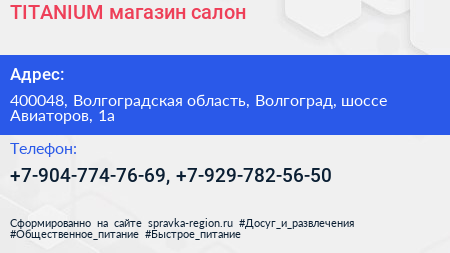 TITANIUM, магазин-салон по адресу 400048, Волгоградская область, Волгоград, шоссе Авиаторов, 1а в дальнейшем Организация, размещена в следующих категориях: