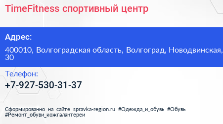 TimeFitness, спортивный центр по адресу 400010, Волгоградская область, Волгоград, Новодвинская, 30 в дальнейшем Организация, размещена в следующих категориях: