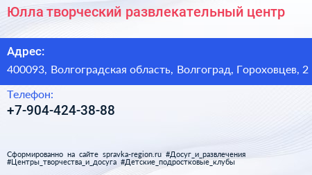 Юлла, творческий развлекательный центр по адресу 400093, Волгоградская область, Волгоград, Гороховцев, 2 в дальнейшем Организация, размещена в следующих категориях: