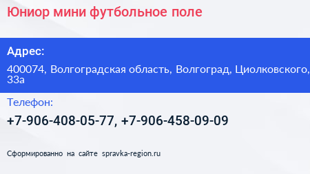 Юниор, мини-футбольное поле по адресу 400074, Волгоградская область, Волгоград, Циолковского, 33а в дальнейшем Организация, размещена в следующих категориях: