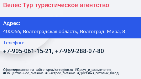Велес-Тур, туристическое агентство по адресу 400066, Волгоградская область, Волгоград, Мира, 8 в дальнейшем Организация, размещена в следующих категориях: