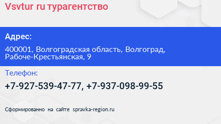 Vsvtur.ru, турагентство по адресу 400001, Волгоградская область, Волгоград, Рабоче-Крестьянская, 9 в дальнейшем Организация, размещена в следующих категориях: