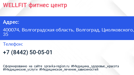 WELLFIT, фитнес-центр по адресу 400074, Волгоградская область, Волгоград, Циолковского, 35 в дальнейшем Организация, размещена в следующих категориях: