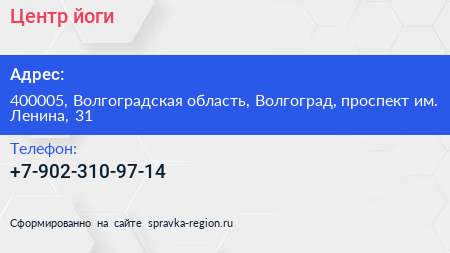 Центр йоги по адресу 400005, Волгоградская область, Волгоград, проспект им. Ленина, 31 в дальнейшем Организация, размещена в следующих категориях: