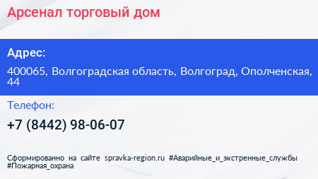 Арсенал, торговый дом по адресу 400065, Волгоградская область, Волгоград, Ополченская, 44 в дальнейшем Организация, размещена в следующих категориях: