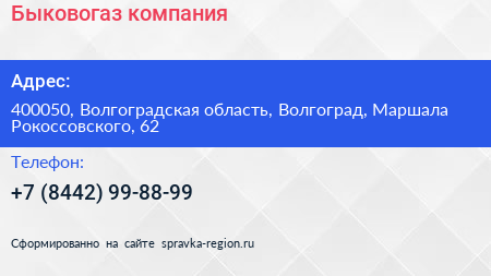 Быковогаз, компания по адресу 400050, Волгоградская область, Волгоград, Маршала Рокоссовского, 62 в дальнейшем Организация, размещена в следующих категориях: