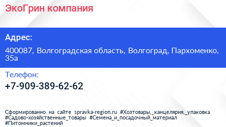 ЭкоГрин, компания по адресу 400087, Волгоградская область, Волгоград, Пархоменко, 35а в дальнейшем Организация, размещена в следующих категориях: