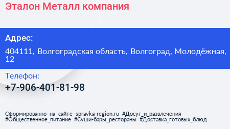 Эталон-Металл, компания по адресу 404111, Волгоградская область, Волгоград, Молодёжная, 12 в дальнейшем Организация, размещена в следующих категориях: