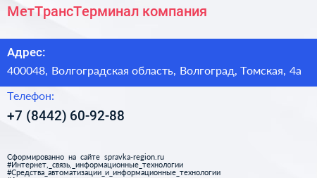 МетТрансТерминал, компания по адресу 400048, Волгоградская область, Волгоград, Томская, 4а в дальнейшем Организация, размещена в следующих категориях: