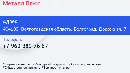 Металл Плюс по адресу 404130, Волгоградская область, Волгоград, Дорожная, 7 в дальнейшем Организация, размещена в следующих категориях: