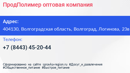ПродПолимер, оптовая компания по адресу 404130, Волгоградская область, Волгоград, Логинова, 23в в дальнейшем Организация, размещена в следующих категориях: