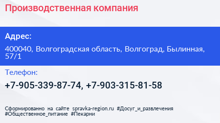 Производственная компания по адресу 400040, Волгоградская область, Волгоград, Былинная, 57/1 в дальнейшем Организация, размещена в следующих категориях: